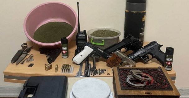Aramalarda 1 kilo 244 gram esrar, 29 hap şeklinde sentetik ecza, hassas terazi, 5 ruhsatsız tabanca, 27 fişek, kama, el telsizi ile kelepçe ele geçirildi.