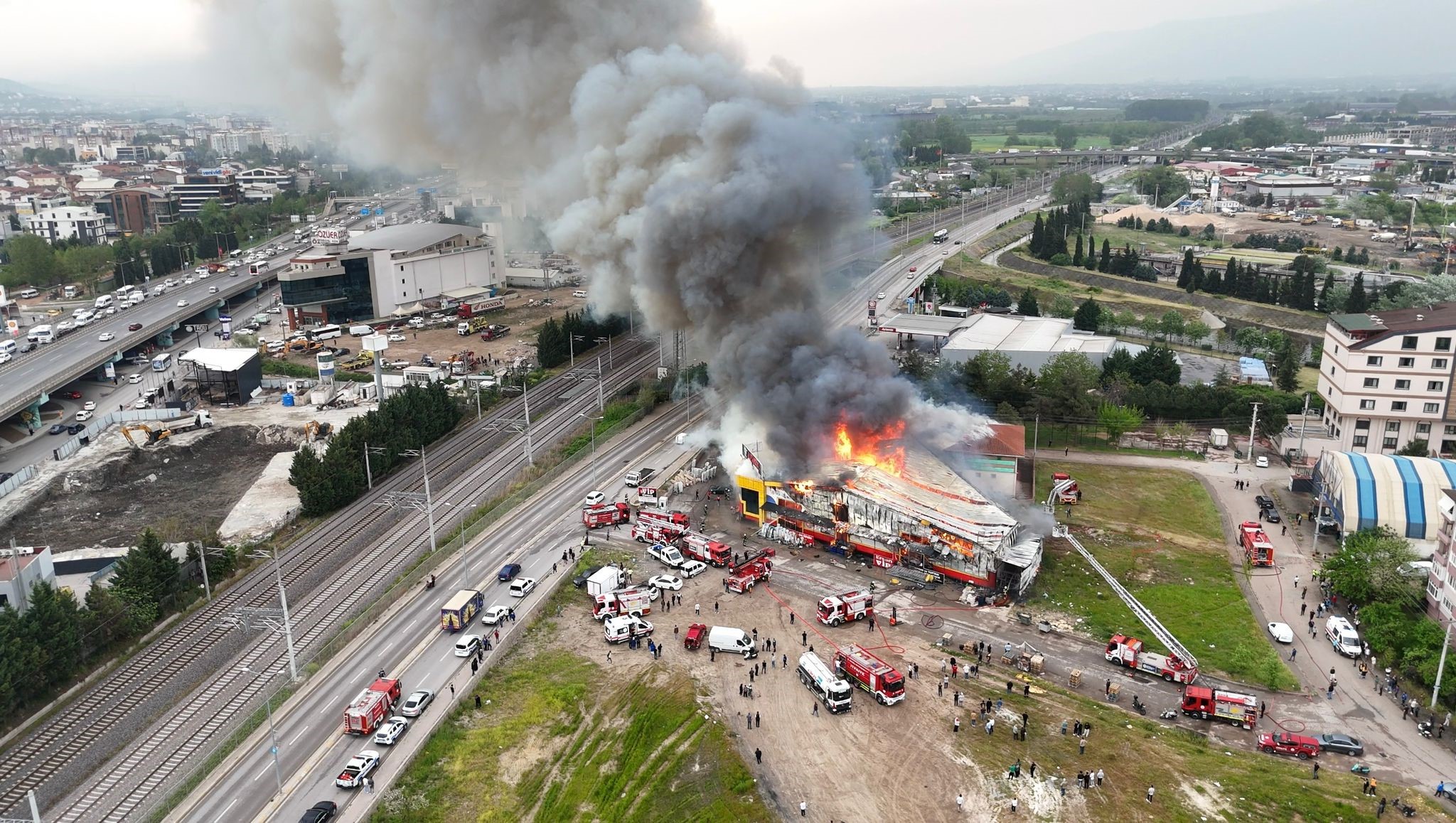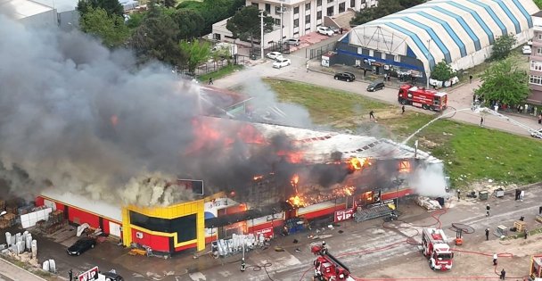 Kocaeli'nin İzmit ilçesinde çıkan market yangını havadan görüntülendi. Yangıda 34 araç, 84 personel ile müdahale ediliyor.