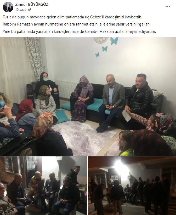 Gebze Belediye Başkanı Zinnur Büyükgöz, gece saatlerinde sosyal medya hesabından yaptığı paylaşımda yangında ölen 3 işçinin Kocaelili olduğunu açıkladı. Başkan Büyükgöz, yangında hayatını kaybedenlerin ailelerine taziye ziyaretinde bulundu. Büyükgöz, paylaşımında şu ifadelere yer verdi: "Tuzla’da bugün meydana gelen elim patlamada üç Gebzeli kardeşimizi kaybettik. Rabbim Ramazan ayının hürmetine onlara rahmet etsin, ailelerine sabır versin inşallah. Yine bu patlamada yaralanan kardeşlerimize de Cenab-ı Hakktan acil şifa niyaz ediyorum."