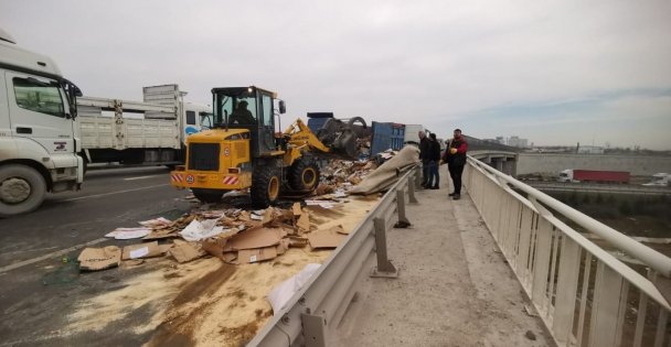 Depodan aldığı hurda kağıtları Balçık köyündeki üretim tesisine götüren Kemal Ş. idaresindeki 34 GV 650 plakalı kamyon, Kirazpınar Mahallesi Anadolu Otoyolu üst geçidinde devrildi. Sürücünün yara almadığı kazada, hurda kağıtlar savrularak yolu kapattı. İhbar üzerine olay yerine jandarma ve polis ekipleri sevk edildi. Yolda güvenlik önlemi alan polis ekipleri, trafik akışını tek şeritten kontrollü sağladı. Kamyonun kaldırılması ve hurda kağıtların toplanmasının ardından ulaşım normale döndü.