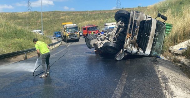 Kocaeli’nin Dilovası ilçesinde kontrolden çıkan kimyasal yüklü tır devrildi. Kazadan sürücü burnu dahi kanamadan kurtulurken, yola saçılan kimyasal madde itfaiye ekiplerince temizlendi.