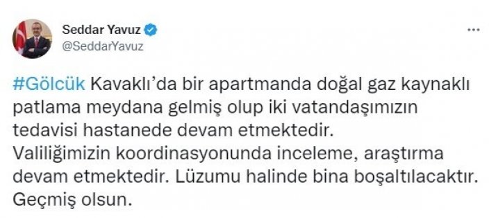 Kocaeli Valisi Seddar Yavuz, Gölcük'te meydana gelen patlamaya ilişkin yaptığı açıklamada, "Doğal gaz kaynaklı patlama meydana gelmiş olup, iki vatandaşımızın tedavisi hastanede devam etmektedir. Valiliğimizin koordinasyonunda inceleme, araştırma devam etmektedir. Lüzumu halinde bina boşaltılacaktır" dedi.