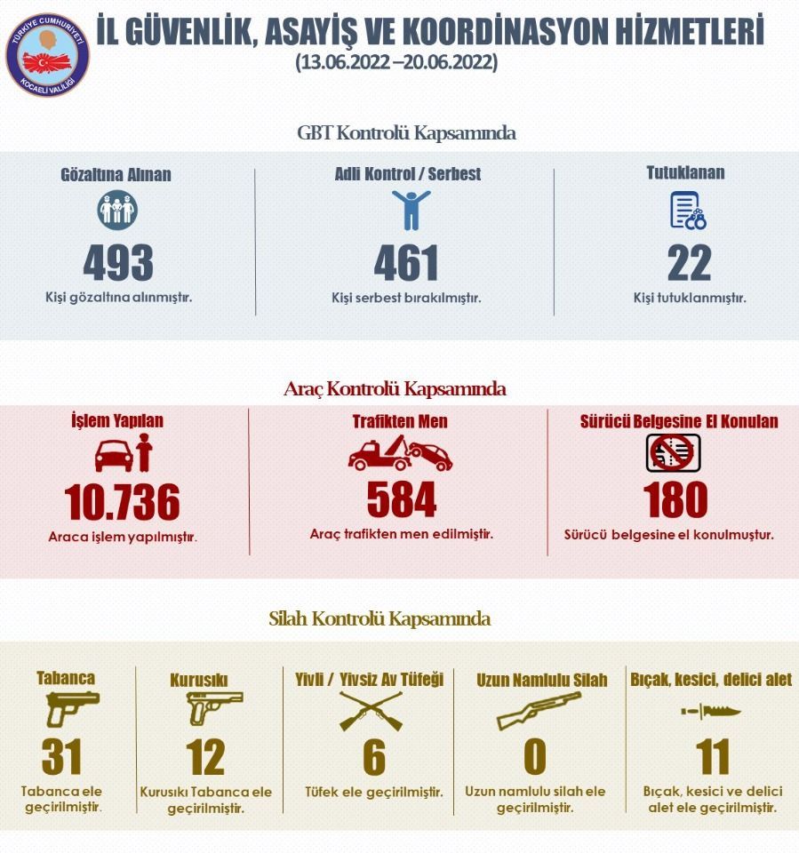 Yine aynı dönemde güvenlik güçlerince yapılan GBT kontrollerinde 493 kişi gözaltına alındı. 461 kişi serbest kalırken çeşitli suçlardan arandığı belirlenen 22 kişi tutuklandı. Yapılan araç kontrollerinde 10 bin 736 araca işlem yapıldı, 584 araç trafikten men edildi, 180 kişinin ise sürücü belgesine el konuldu. Silah kontrolü kapsamında 31 tabanca, 12 kurusıkı, 6 av tüfeği ve 11 adet kesici alet ele geçirildi.