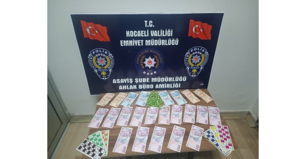Kocaeli İl Emniyet Müdürlüğünce kumar oynamak için yer ve imkan sağlamak suçunun engellemesine yönelik 8 Mart-9 Nisan tarihleri arasında il genelinde faaliyet gösteren umuma açık eğlence ve istirahat yerlerine baskın düzenlendi. Yapılan baskında 123 bin 410 TL, 100 avro, 100 dolar kumar parası ile bin 350 tombala pulu, 15 tombala kartonu, 166 tombala kartı, 8 deste iskambil kağıdı ve 8 okey takımına el konuldu. Denetimde 31 işletme sahibi hakkında adli işlem yapılırken kumar oynadığı tespit edilen 160 şahsa 1 milyon 28 bin TL idari para cezası uygulandı. Kumar oynanan 21 ruhsatsız işletmenin süresiz, 10 işletmenin ise geçici olarak faaliyetten men edildi.