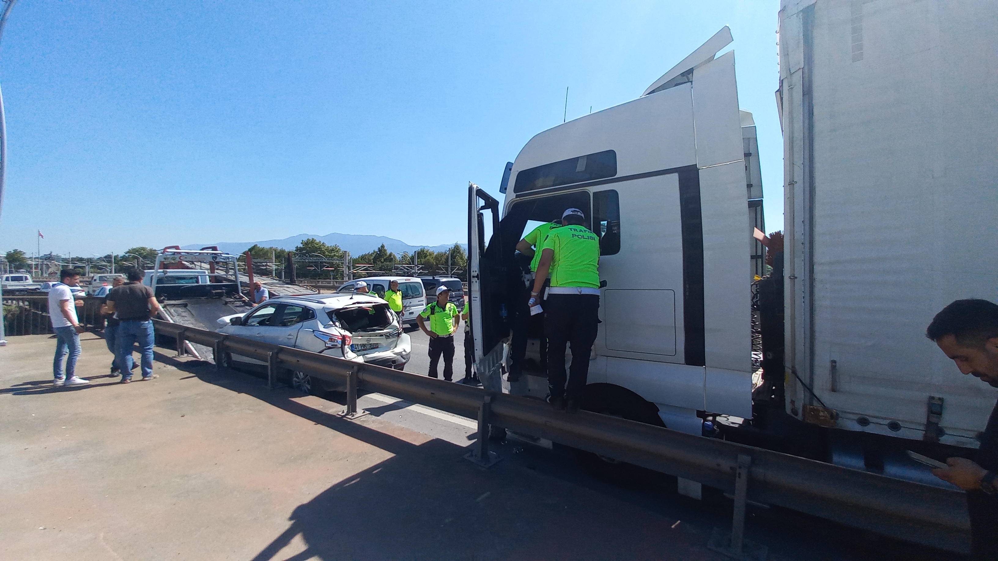 Kaza, Kemal Paşa Mahallesi D- 100 kara yolu Ankara İstikameti Halkevi mevkiinde meydana geldi. Edinilen bilgiye göre, Almanya plakalı MO IL 4030 plakalı Man marka tır, fenalaşan sürücüsünün kontrolünden çıkarak önce aynı yönde giden 41 HK 309 plakalı Nissan marka otomobile, ardından da bariyerlere çarptı. Tır, 41 ABD 534 plakalı kamyonete çarparak durabildi. 112 Acil Çağrı Merkezi'ne yapılan ihbar üzerine adrese sağlık ve polis ekipleri sevk edildi. Sağlık ekiplerince ilk müdahalesi olay yerinde yapılan H.H., tırdan çıkartılarak ambulansa taşındı. H.H. ardından Kocaeli Devlet Hastanesine götürüldü.