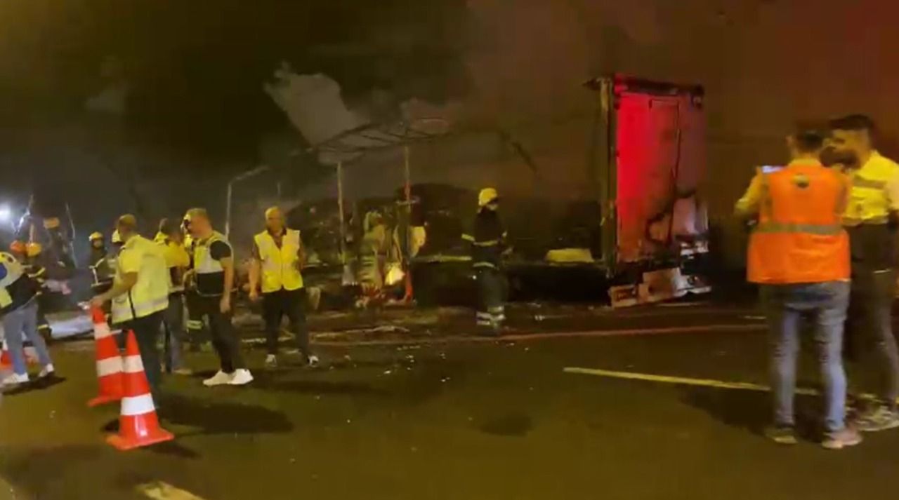 Kuzey Marmara Otoyolu'nda tır alev alev yandı, yangın sebebiyle uzun araç kuyrukları oluştu.