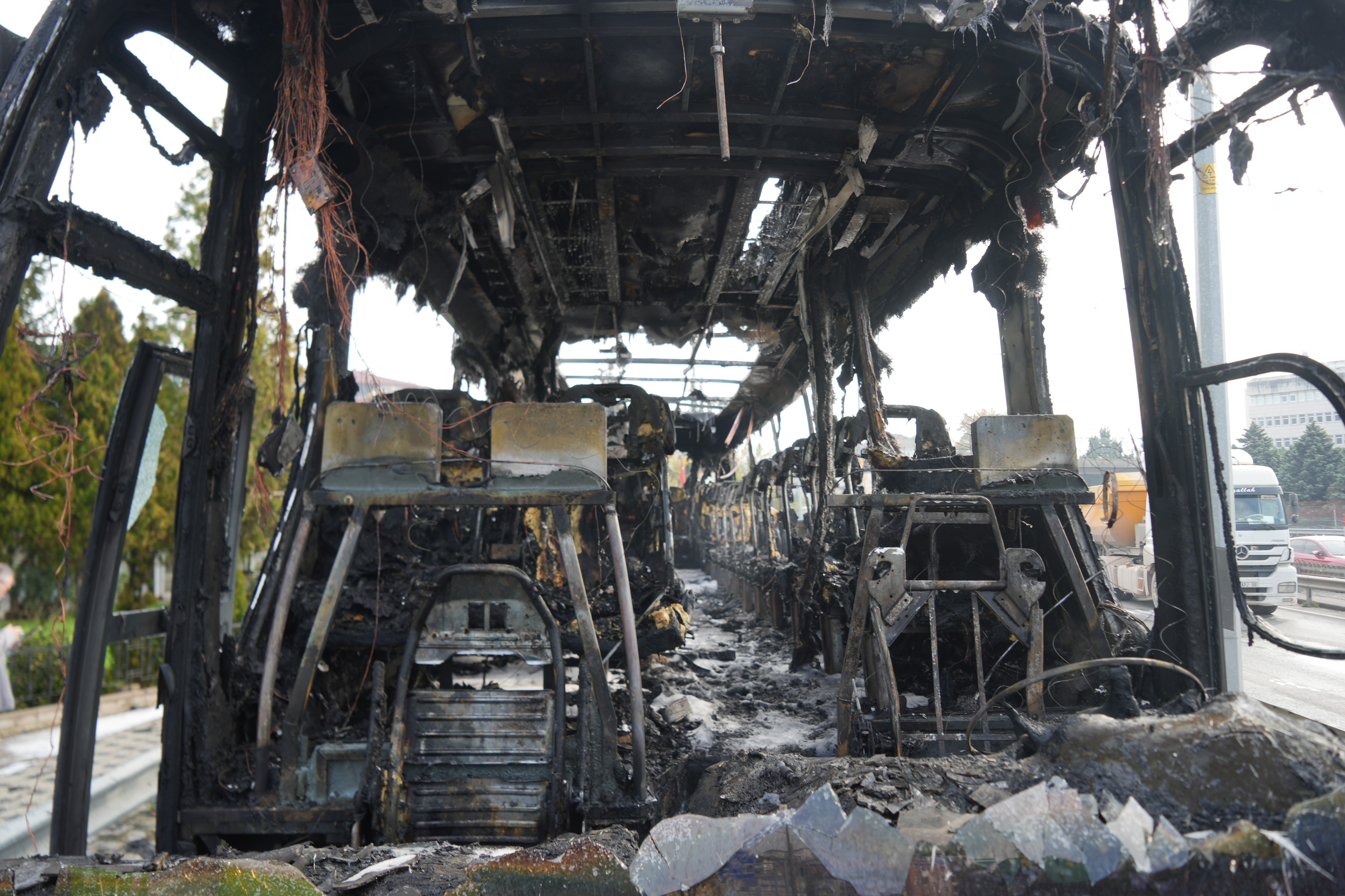 D-100 kara yolunun Kocaeli geçişinde alevlere teslim olan yolcu otobüsü demir yığınına döndü.