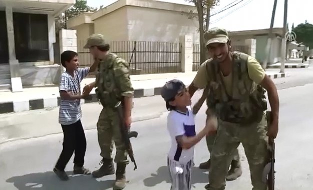 Özgür Suriye Ordusu'nun kontrolü ele geçirdiği Suriye'nin Halep kentine bağlı Cerablus'ta daha güvenli bir hayata kavuştuklarını belirten çocuklar, mutluluklarını askerlerle paylaştı.