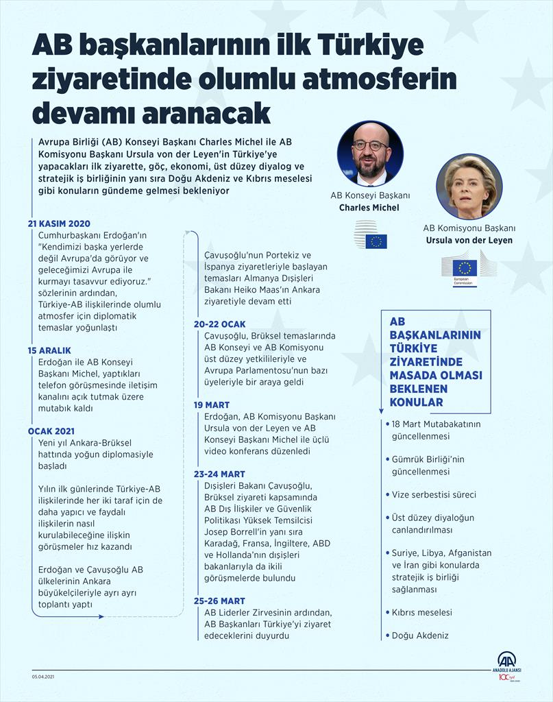 Avrupa Birliği (AB) Konseyi Başkanı Charles Michel ile AB Komisyonu Başkanı Ursula von der Leyen'in Türkiye'ye yapacakları ilk ziyarette, göç, ekonomi, üst düzey diyalog ve stratejik iş birliğinin yanı sıra Doğu Akdeniz ve Kıbrıs meselesi gibi konuların gündeme gelmesi bekleniyor.