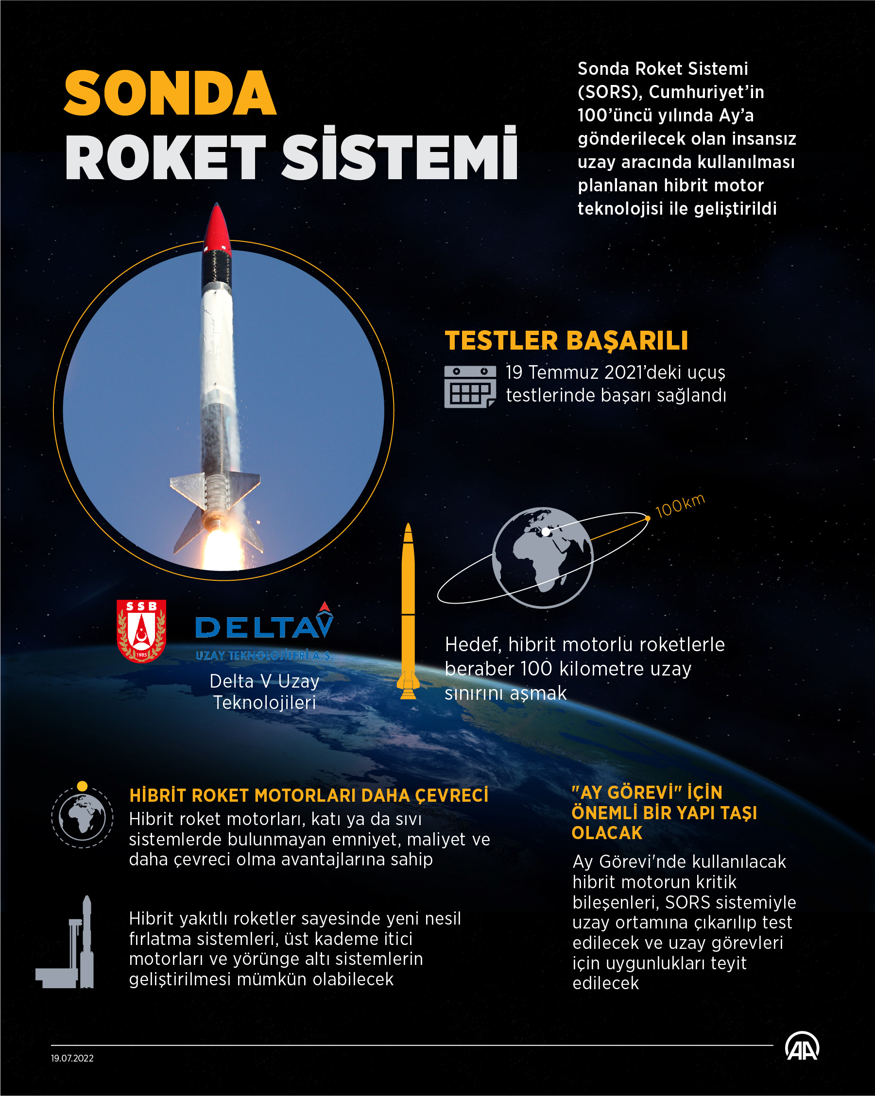 Sonda Roket Sistemi (SORS), Cumhuriyet’in 100’üncü yılında Ay’a gönderilecek olan insansız uzay aracında kullanılması planlanan hibrit motor teknolojisi ile geliştirildi.