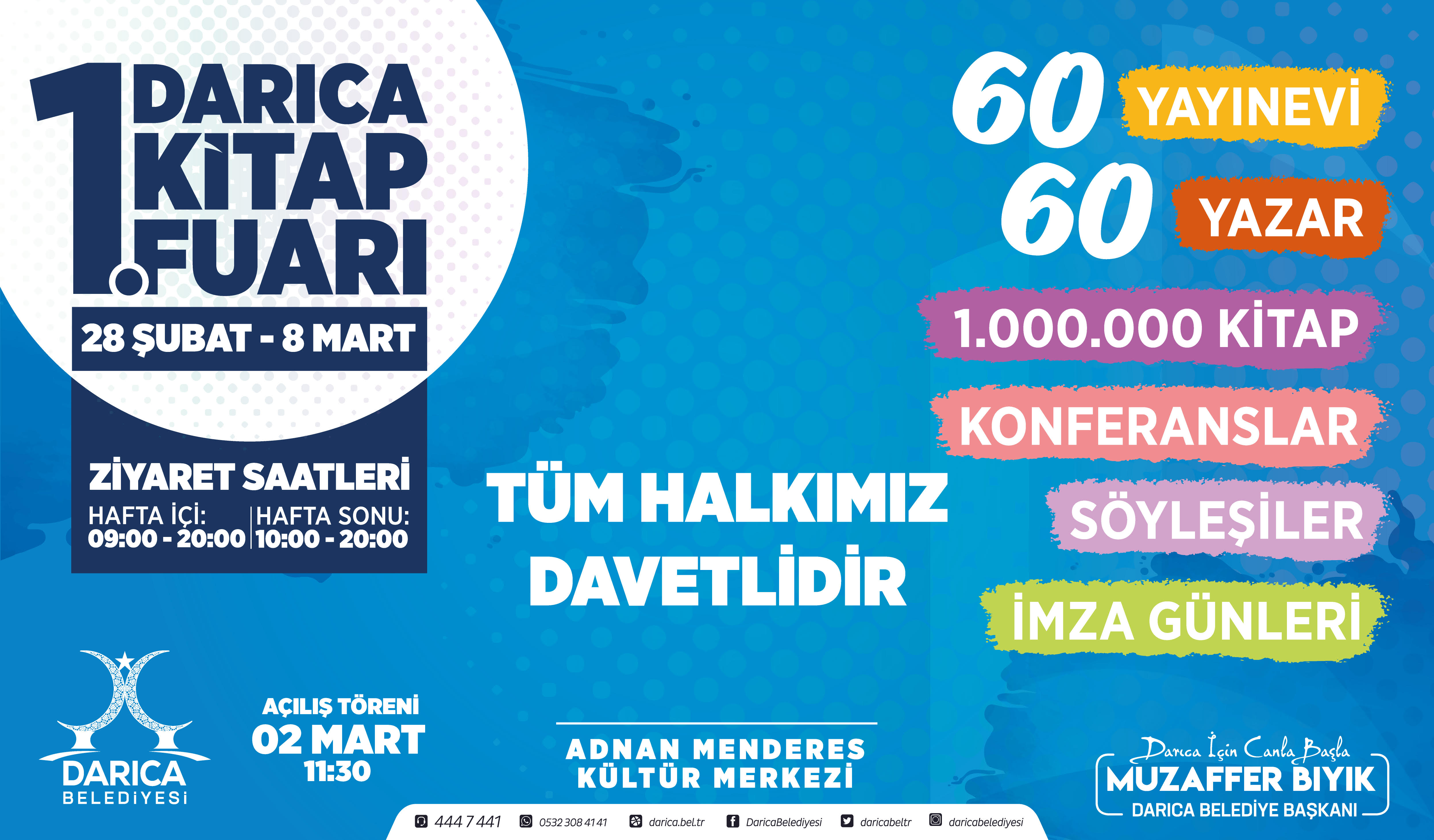 Darıca Belediye Başkanı Muzaffer Bıyık, Darıcalıları kitap fuarına davet ederken “Darıca’mızda önemli bir ihtiyaç olan kitap fuarını düzenleyerek özellikle gençlerin ve tüm kitapseverlerin kitaplara kolay ulaşmasını amaçladık. Dünyayı yöneten, kalem, mürekkep ve kâğıttır. Başarının en büyük sırrı okumaktır. Okumanın yeri, zamanı ve sonu yoktur. Bizleri geleceğe taşıyacak ve muasır medeniyetler seviyesine çıkartacak olan ise daha fazla okumaktır. Darıca Belediyesi olarak herkes okusun diye 1. Darıca Kitap Fuarı’nı gerçekleştiriyoruz. 28 Şubat - 08 Mart tarihinde düzenlenecek olan Kitap Fuarı ile 60 Yayınevi, 60 Yazar ve 1 Milyon kitabı Darıcalı kitapseverlerle buluşturacağız. Konferanslar, söyleşiler ve imza günleriyle siz değerli hemşerilerimizi yazarlarla buluşturacağız. Darıca’da birincisini gerçekleştireceğimiz Kitap Fuarı’na tüm halkımızı davet ediyoruz” dedi..jpg)