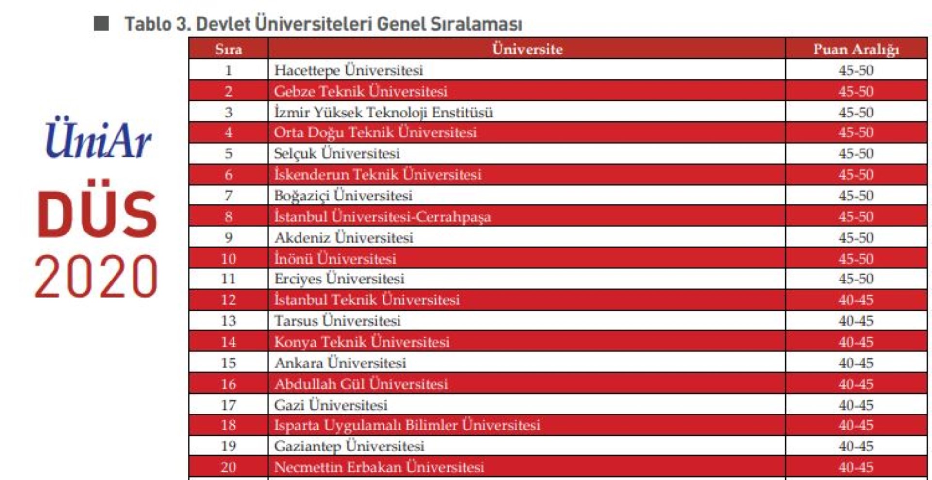 Üniversite Araştırmaları Laboratuvarı (ÜniAr) Devlet Üniversitesi ve Fakülteleri Sıralaması (DÜS) açıklandı. Temel amacı Türkiye’deki devlet üniversiteleri ve bu üniversitelere bağlı fakülteleri akademik teşvik performanslarına göre sıralamak olan listede Gebze Teknik Üniversitesi(GTÜ), Hacettepe Üniversitesi’nin ardından ikinci olarak sıralandı. 123 üniversitenin dahil edildiği sıralamada, üniversitelerin akademik teşvik komisyonları tarafından onaylanan puanlar ile YÖK tarafından yayınlanan öğretim üyesi verileri kullanıldı. Sıralamada üniversiteler Proje, Araştırma, Yayın, Tasarım, Sergi, Patent, Atıf, Tebliğ, Ödül gibi 9 kriterlere göre değerlendirildi.
