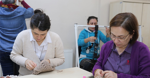 Hanımlar kursta makromeden çantalar da yapıyor. İpliklerin birbirine geçmesiyle ortaya çıkan makrome çantalar, şimdiden yaz aylarında kullanılmak üzere hazır bekliyor.