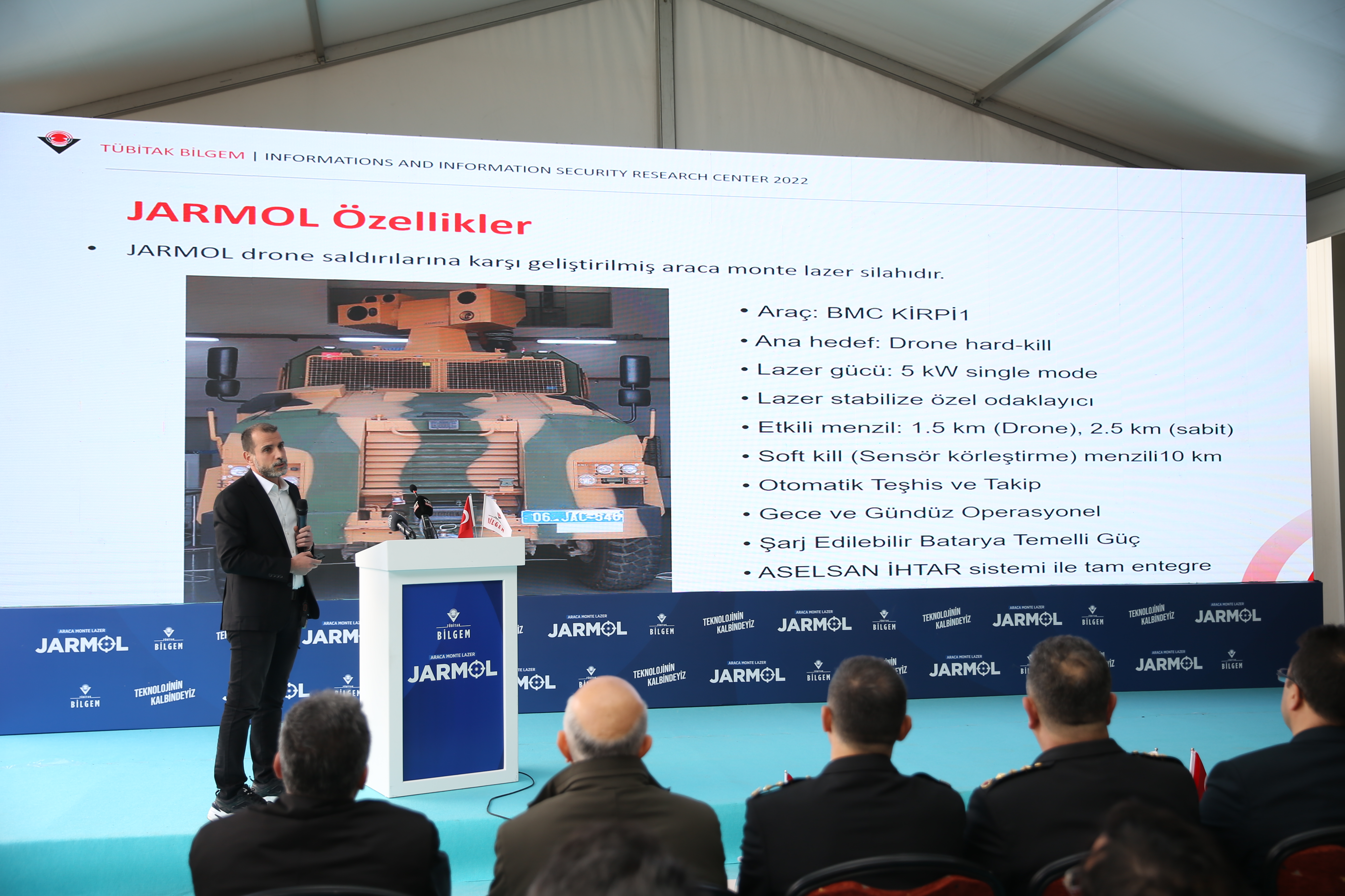 TÜBİTAK Bilişim ve Bilgi Güvenliği İleri Teknolojiler Araştırma Merkezi (BİLGEM) mühendisleri tarafından yerli ve milli teknoloji olanaklarıyla Jandarma Genel Komutanlığı için geliştirilen Jandarma Araca Monte Milli Lazer Sistemi'nin (JARMOL) tanıtımı yapıldı.