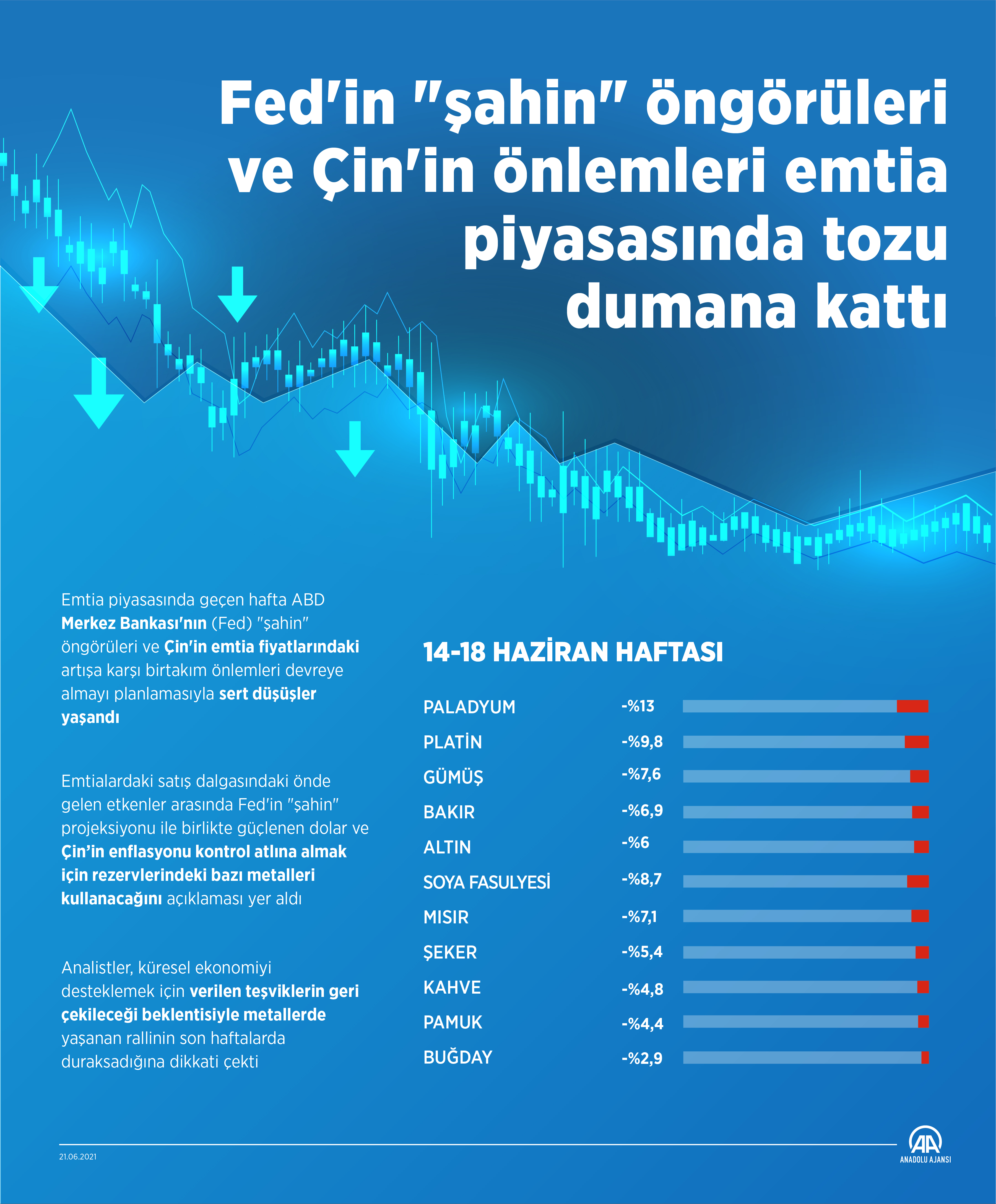 Emtia piyasasında geçen hafta, ABD Merkez Bankası'nın (Fed) "şahin" öngörüleri ve Çin'in, emtia fiyatlarındaki artışa karşı birtakım önlemleri devreye almayı planlamasıyla sert düşüşler yaşandı.