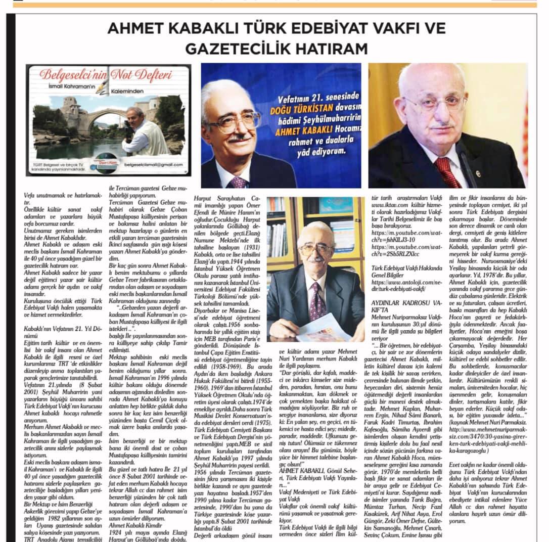 Vefatının 21.yılında (8 Şubat 2001) Şeyhül Muharririn yani yazarların büyüğü ünvanı sahibi Türk Edebiyat Vakfı’nın kurucusu Ahmet kabaklı hocayı rahmetle anıyorum.