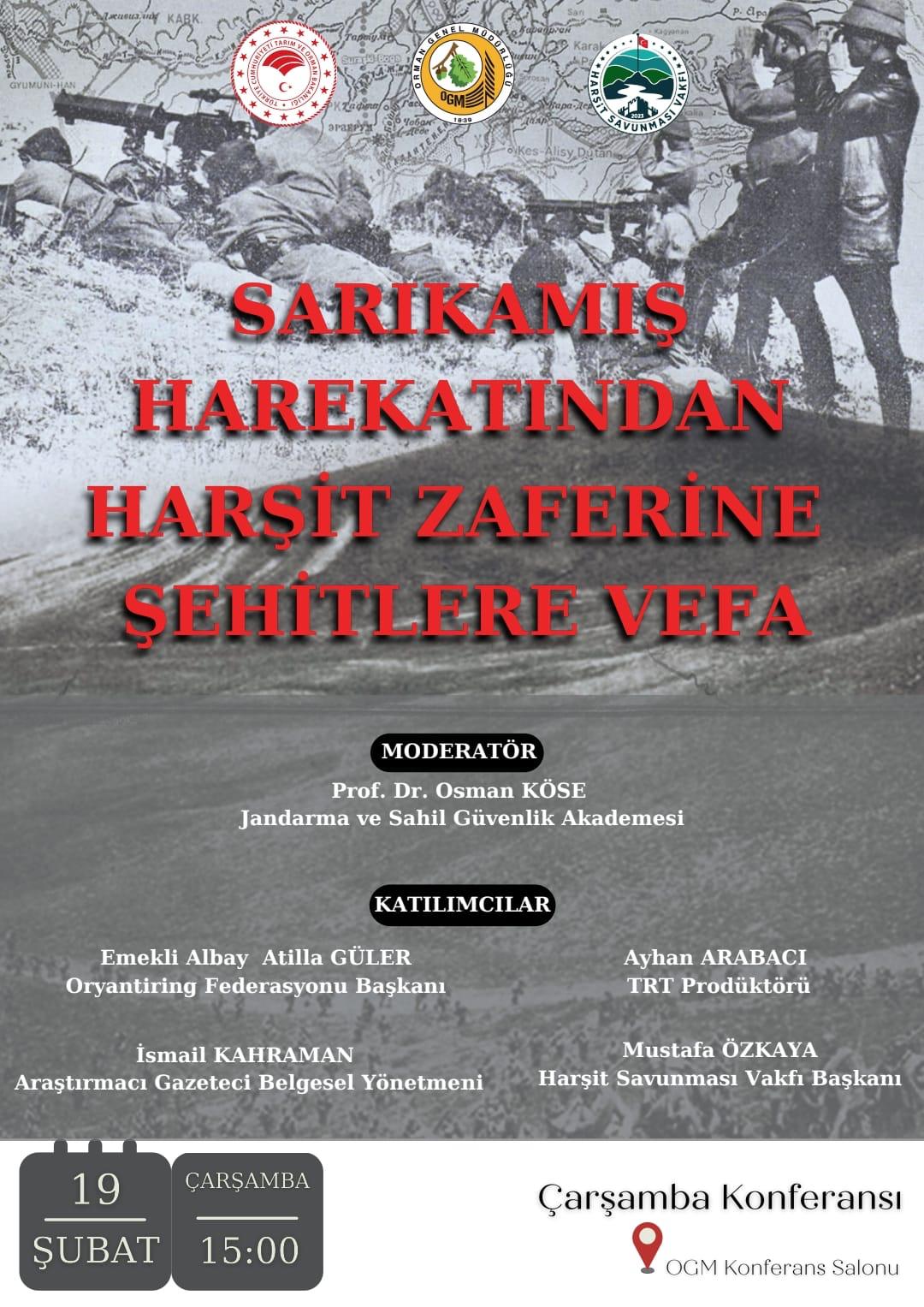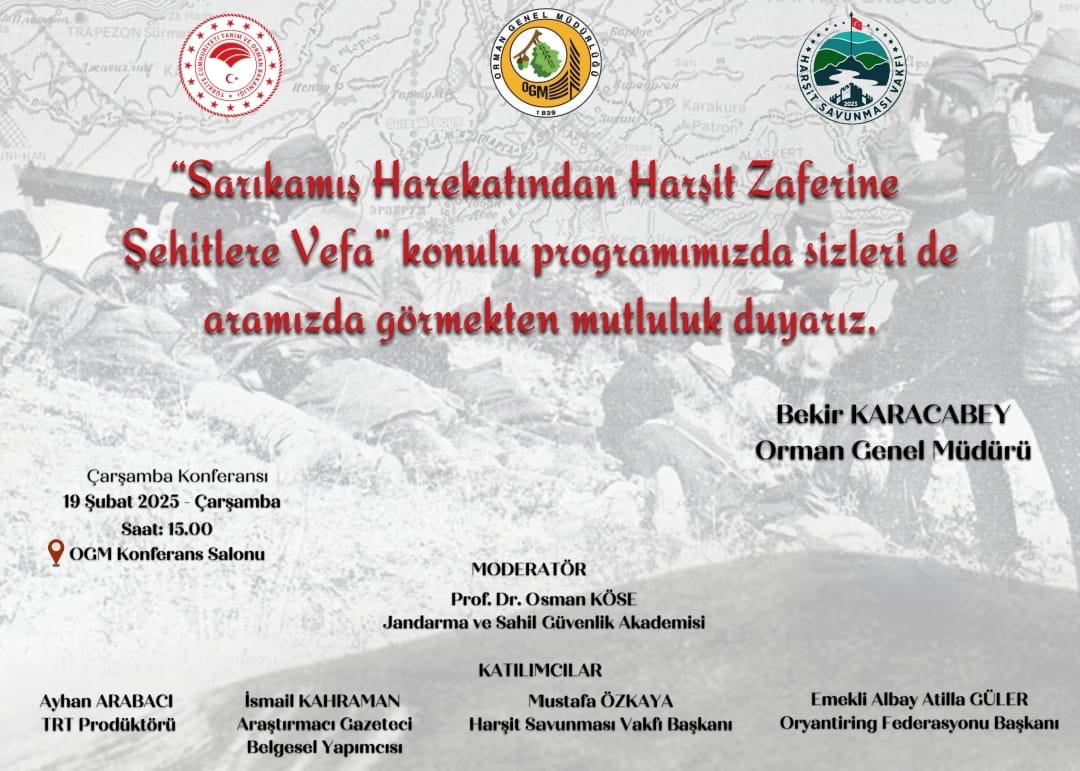 Harşit Savunması, Türkiye’nin başkenti Ankara’da önemli bir konferans ile gündeme taşınıyor. 19 Şubat Çarşamba günü saat 15.00’te Orman Genel Müdürlüğü (OGM) Konferans Salonu’nda düzenlenecek olan “Sarıkamış Harekâtından Harşit Zaferine Şehitlere Vefa” başlıklı program, alanında uzman isimleri bir araya getirecek.