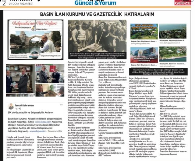 Gebze gazetesi ve Gazete Gebze’de belgeselcinin not defteri köşesinde BİK hakkında yazdığım iki makalenin linkini sizlerle bugün paylaşmak istiyorum.