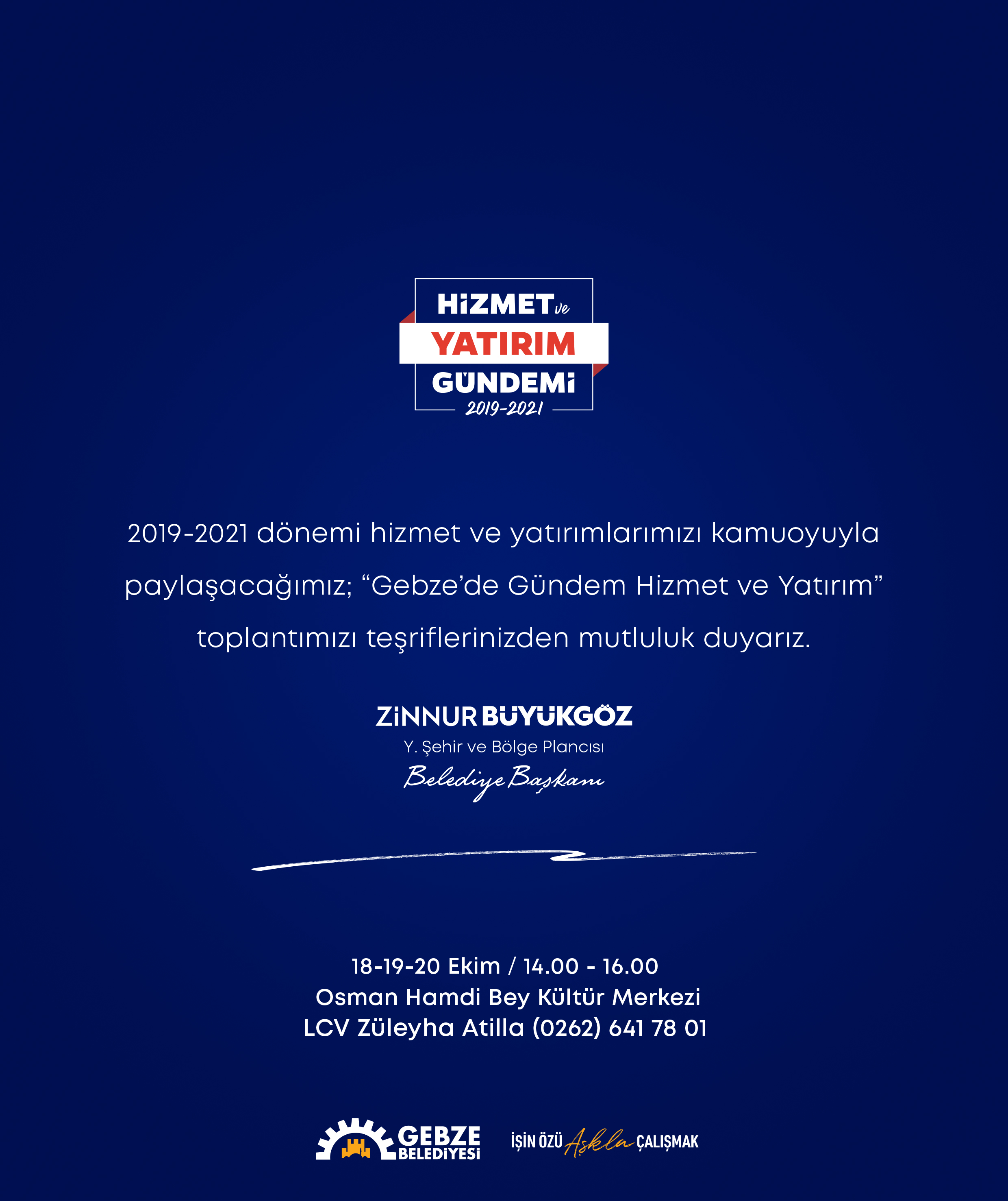 Osman Hamdi Bey Kültür Merkezi Salonu’nda pandemi kurallarına uygun olarak gerekli tüm tedbirlerin alınacağı, “Hizmet ve Yatırım Gündemi 2019-2021” isimli tanıtım toplantılarında Gebze Belediye Başkanı Zinnur Büyükgöz; Gebze’deki siyasi parti teşkilat ve temsilcileri, iş dünyası temsilcileri, il ve ilçe protokolü, dernekler ve tüm sivil toplum kuruluşlarının temsilcilerine ve tüm Gebze kamuoyuna, yatırımlar ve projelere ilişkin sunum ve bilgilendirmede bulunacak. Toplantıların başlama saati ise 14:00 olarak belirlendi.