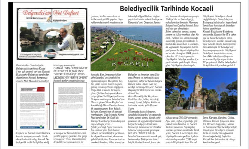 Osmanlı’dan Cumhuriyet’e Belediyecilik tarihinde Kocaeli’nin çok önemli yeri var. Kocaeli Büyükşehir Belediyesi tarafından düzenlenen Kocaeli Sempozyumunda Milli Mücadele Servetiye Cephesi ve Kocaeli Tarihi-Kültürü konulu sempozyumunda biz de davetli olarak katılıp, Kocaeli Belediyecilik tarihi ile ilgili bir tebliğ hazırlayıp sunmuştuk.