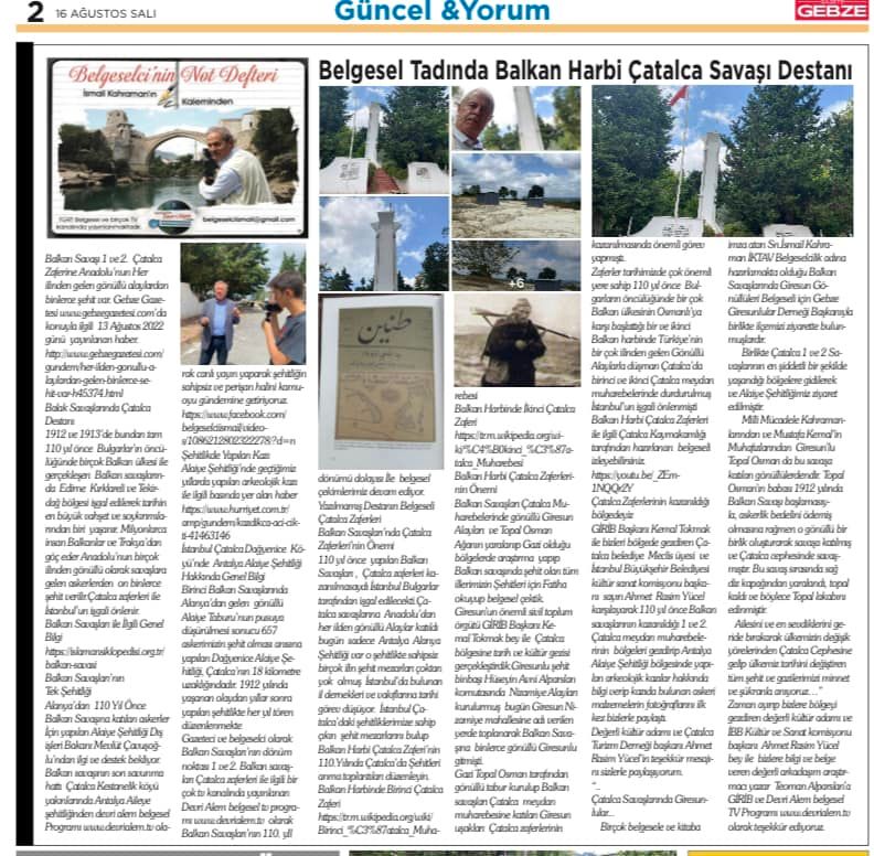 Gazeteci ve belgeselci olarak Balkan Savaşları’nın dönüm noktası 1 ve 2. Balkan savaşları Çatalca zaferleri ile ilgili bir çok tv kanalında yayınlanan Devri Alem belgesel tv programı www.devrialem.tv olarak Balkan Savaşları’nın 110. yIl dönümü dolayısı İle belgesel çekimlerimiz devam ediyor.