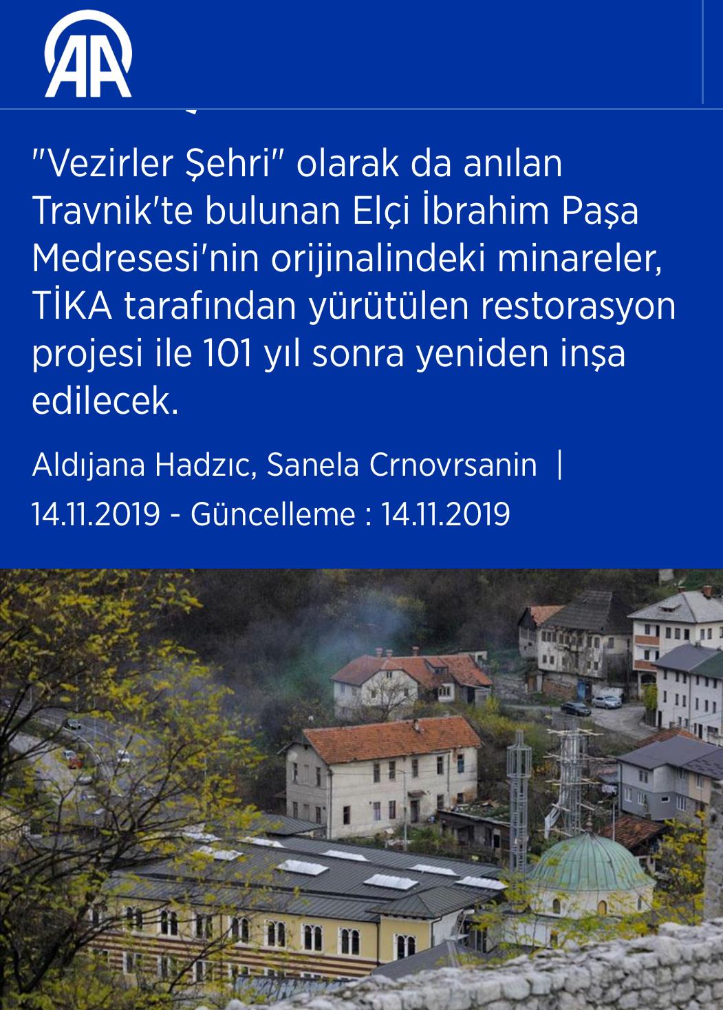 Osmanlı döneminde 77 vezir çıkaran ve halk arasında "Vezirler Şehri" olarak anılan Travnik'in sembollerinden biri medresenin orijinalindeki minareler, proje ile 101 yıl sonra yeniden inşa ediliyor.