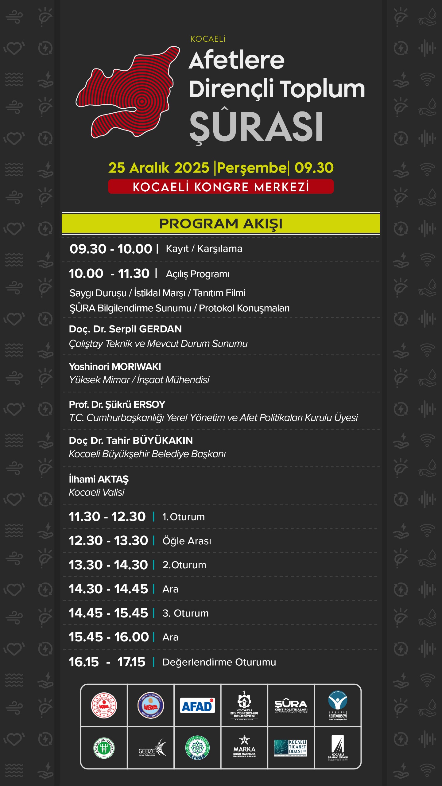 Afetlere hazırlık ve dayanıklılık alanında örnek projelere imza atan Kocaeli Büyükşehir Belediyesi, kentteki sivil toplum kuruluşlarını, kamu kurumlarını, akademisyenleri ve diğer paydaşları bir araya getirecek olan “Kocaeli Afetlere Dirençli Toplum Şûrası ve Çalıştayı’nı” 25 Aralık Perşembe günü (yarın) saat 09.30’da Kocaeli Kongre Merkezi’nde gerçekleştirecek. Büyükşehir öncülüğünde, ŞÛRA Kent Politikaları ve Araştırmaları Merkezi tarafından düzenlenecek olan bu çalıştayda; Kocaeli’de afet yönetimi kapasitesinin güçlendirilmesi, paydaşlar arası iş birliğinin artırılması ve toplumsal faydayı önceleyen somut politika ile proje önerileri oluşturulacak.