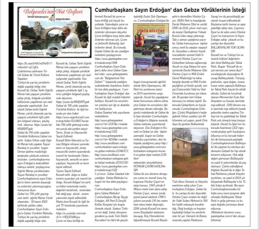 Cumhurbaşkanı Sayın Erdoğan’a daha önce Gebze Gazetesi’nden www.gebzegazetesi.com da ‘’Belgeselcinin Not Defteri”” köşesinde yazdığım makalelerden bazılarının linkini bir kez daha paylaşıyor, Cumhurbaşkanı Sayın Erdoğan’ dan Kocaeli ile ilgili müjdeli haberler bekliyor, Kocaeli’nin sorunlarının çözümü için ilgi ve desteklerini bekliyorum.