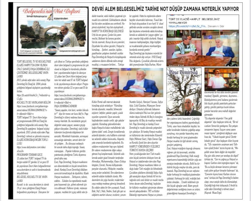Kocaeli tv de www.devrialem.tv olarak 19 yıl önce çektiğimiz Elazığ Harput belgeselimiz yayınlanıyor. Dünyanın bir çok ülkesi ve Türkiye genelinde çektiğimiz devri alem belgesel tv programımız bir çok ulusal ve bölgesel tv kanalında yıllardan beri yayınlanmakta beğeni ile izleniyor.