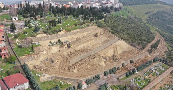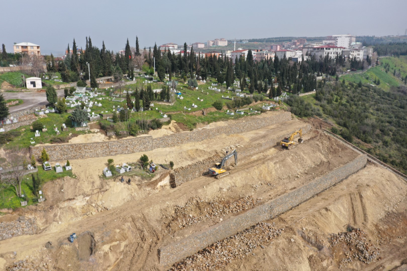 Park ve Bahçeler Daire Başkanlığı ekipleri Dilovası Orhangazi Mezarlığının dik olan kısımlarındaki kademelendirme çalışmasının büyük kısmını bitirdi. Yol oluşturma çalışması kapsamında ihtiyaç duyulan 500 metrelik taş duvar imalatının 350 metrelik kısmı da tamamlandı.