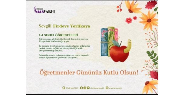 Mehmet Akif İlkokulu 1/I sınıfı velileri ve öğrencileri, 24 Kasım Öğretmenler Günü'nde farkındalık oluşturmak için anlamlı bir hediye düşündü. Öğretmen Firdevs Yerlikaya adına SMA Tip 1 hastası çocuklar için bağış yapıldı. Hediye karşısında büyük mutluluk duyan Firdevs Yerlikaya, hem velilere hem de öğrencilerine teşekkür etti.