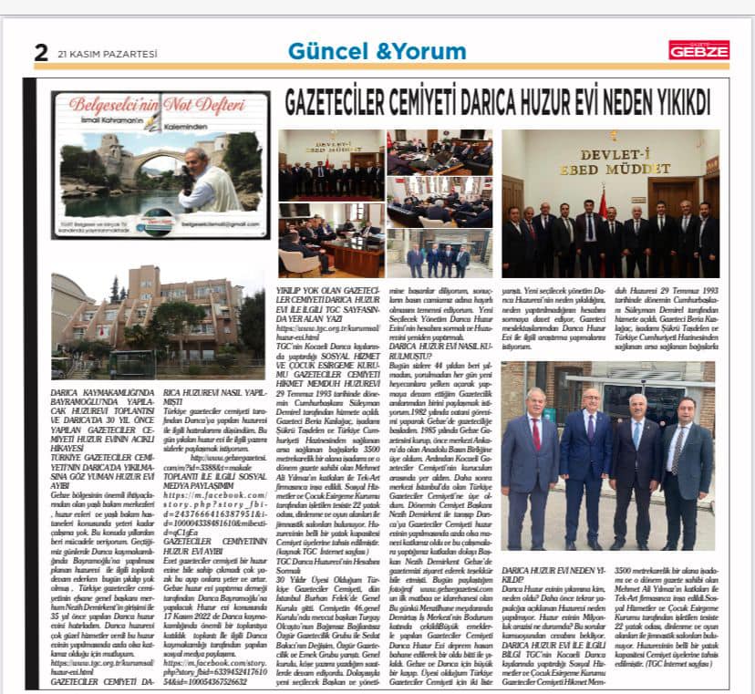 YIKILIP YOK OLAN GAZETECİLER CEMİYETİ DARICA HUZUR EVİ İLE İLGİLİ TGC SAYFASINDA YER ALAN YAZI