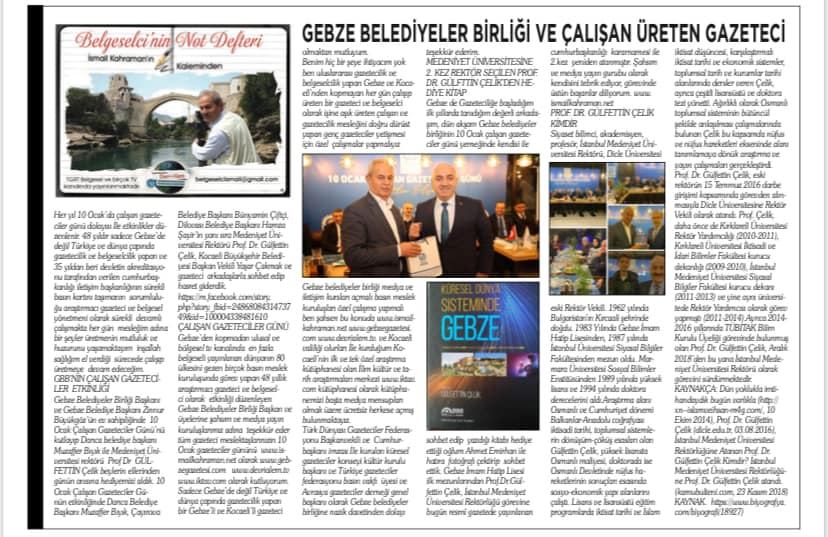 Gebze’den kopmadan ulusal ve bölgesel tv kanalında en fazla belgeseli yayınlanan dünyanın 80 ülkesini gezen birçok basın meslek kuruluşunda görev yapan 48 yıllık araştırmacı gazeteci ve belgeselci olarak etkinliği düzenleyen Gebze Belediyeler Birliği Başkan ve üyelerine şahsım ve medya yayın kuruluşlarımız adına teşekkür eder tüm gazeteci meslektaşlarınızın 10 Ocak gazeteciler gününü www.ismailkahraman.net olarak www.gebzegazetesi.com www.devrialem.tv www.iktav.com olarak kutluyorum. Sadece Gebze’de değil Türkiye ve dünya çapında gazetecilik yapan bir Gebze’li ve Kocaeli’li gazeteci olmaktan mutluyum.