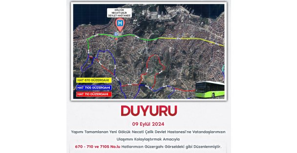 Kocaeli Büyükşehir Belediyesi, 9 Eylül Pazartesi günü hasta kabulüne başlayacak olan Gölcük Necati Çelik Devlet Hastanesi'ne ulaşım için 3 hattın güzergahında değişikliğe gitti. Gölcük Necati Çelik Devlet Hastanesi'nin tamamlanan yeni binası bugün düzenlenecek 12. Açılış Bayramı’nın ardından pazartesi günü hizmet vermeye başlayacak. Hastaneye ulaşım için Kocaeli Büyükşehir Belediyesi yeni kararlar aldı. Bu kapsamda vatandaşların ulaşımını kolaylaştırmak için 670, 710 ve 710S no.lu hatlarda güzergah değişikliğine gidildi.