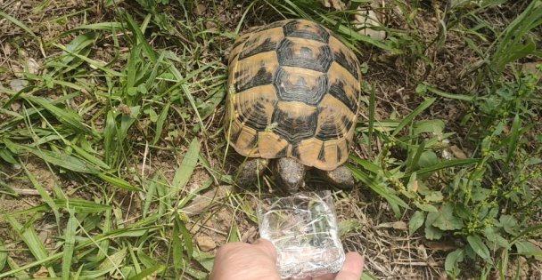 Kocaeli Büyükşehir Belediyesi Tatlıkuyu Vadisi Piknik Alanı'na Mustafa Sarıkaya, ağaç dibinde bir kaplumbağa olduğunu fark etti.