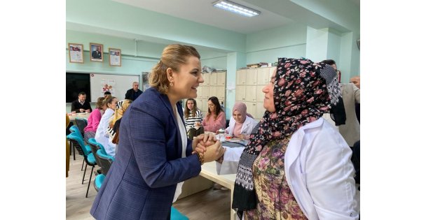Başkan Hürriyet, Kadın Girişimciler Merkezi Mozaik Atölyesi'nde kadınların el emeği ile yaptığı çınar yaprağını ve Kayıp Roma Başkenti Nikomedia'nın Renkli Rölyefleri kitabını okullara hediye etti.