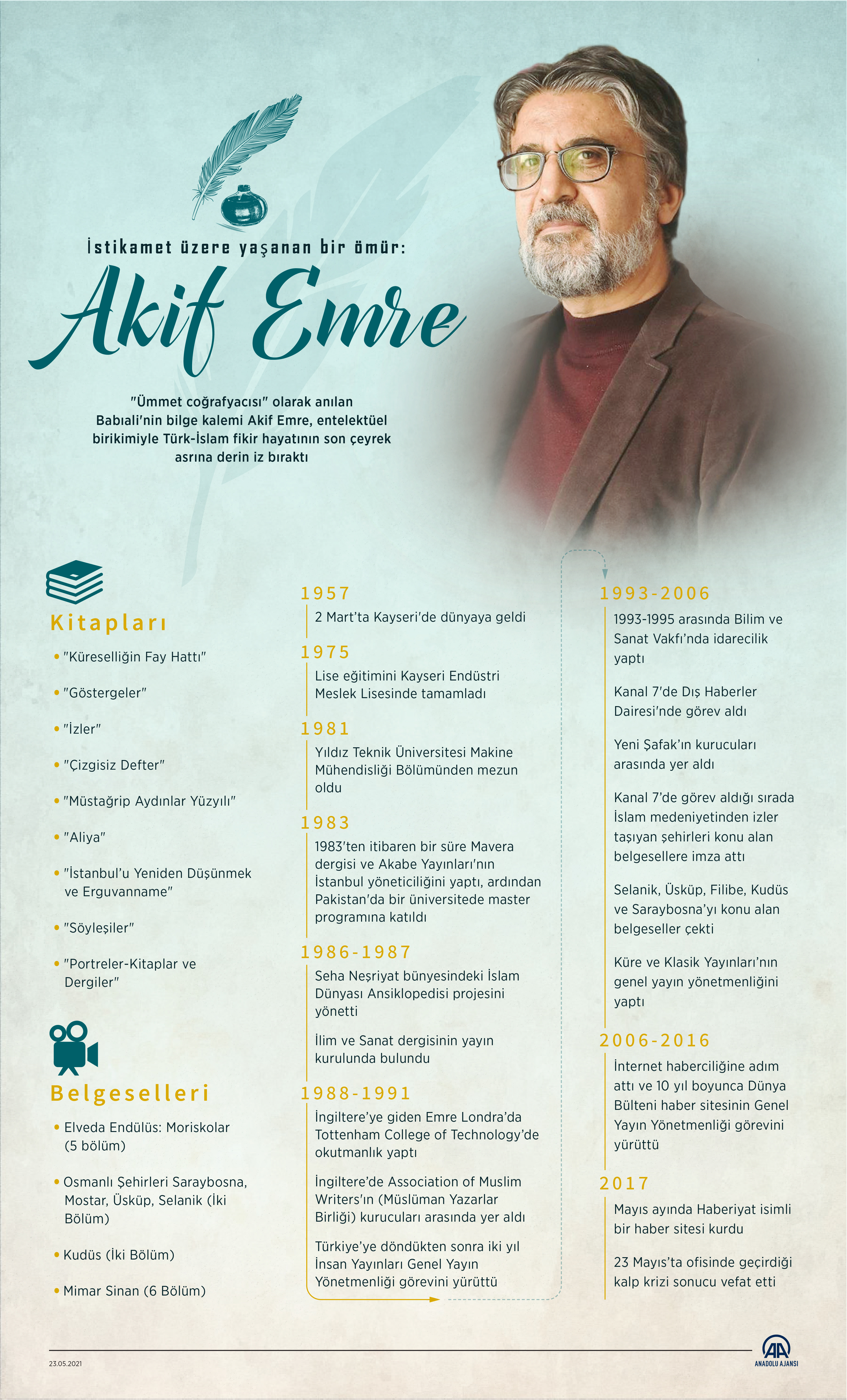 "Ümmet coğrafyacısı" olarak anılan, entelektüel birikimiyle Türk-İslam fikir hayatının son çeyrek asrına derin iz bırakan, Babıali'nin bilge kalemi Akif Emre, vefatının dördüncü yılında anılıyor.