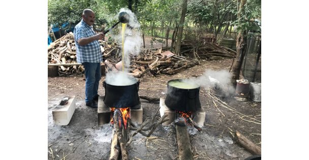 Daha sonra merdanelerden geçirilerek çıkarılan ürünün öz suyu, ince delikli süzgeçte süzülerek kazanlarda odun ateşinde kaynatılıyor. Pekmezin dibinin tutmaması ve yanık kokusunun oluşmaması için de sürekli karıştırılıyor.