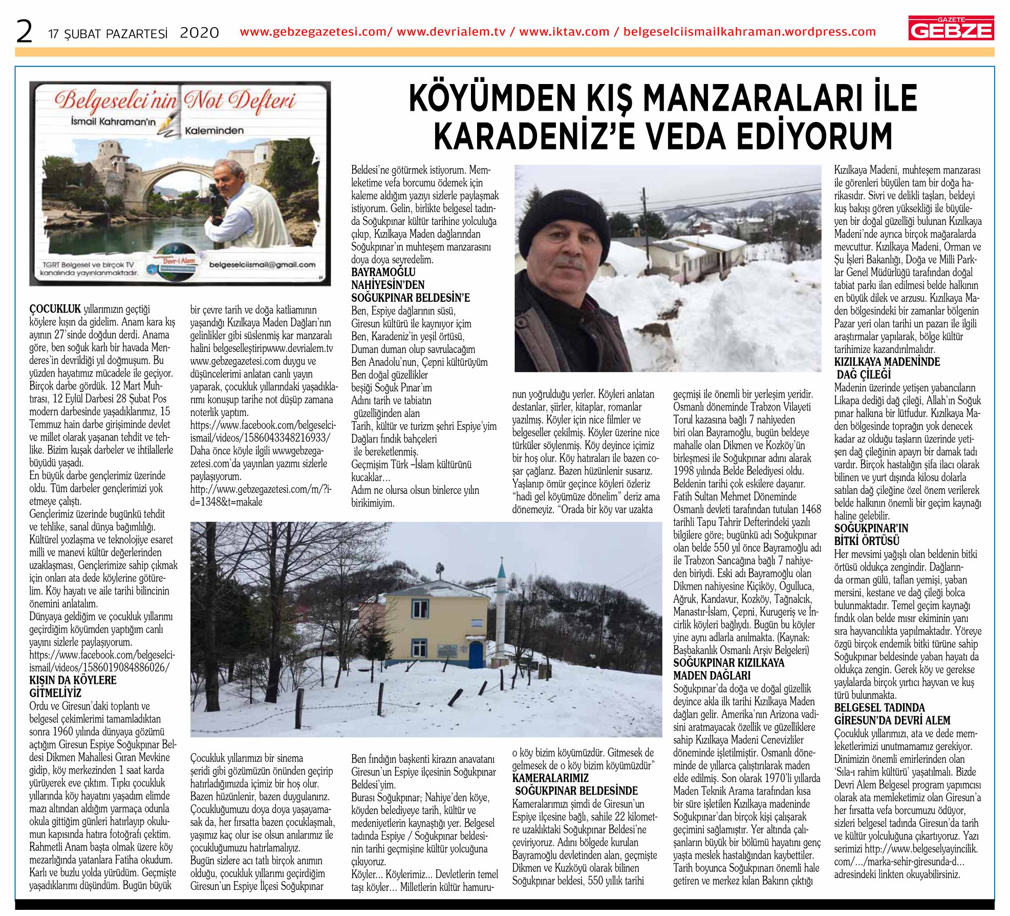 Ordu ve Giresun’daki toplantı ve belgesel çekimlerimi tamamladıktan sonra 1960 yılında dünyaya gözümü açtığım Giresun Espiye Soğukpınar Beldesi Dikmen Mahallesi Gıran Mevkine gidip, köy merkezinden 1 saat karda yürüyerek eve çıktım. Tıpkı çocukluk yıllarında köy hayatını yaşadım elimde mazı altından aldığım yarmaça odunla okula gittiğim günleri hatırlayıp okulumun kapısında hatıra fotoğrafı çektim. Rahmetli Anam başta olmak üzere köy mezarlığında yatanlara Fatiha okudum. Karlı ve buzlu yolda yürüdüm. Geçmişte yaşadıklarımı düşündüm. Bugün büyük bir çevre tarih ve doğa katliamının yaşandığı Kızılkaya Maden Dağları’nın gelinlikler gibi süslenmiş kar manzaralı halini belgeselleştirip www.devrialem.tv