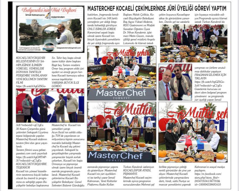 Acun Ilıcalı’nın sahibi olduğu TV8’de yayınlanan ve milyonlarca kişinin sonucunu merakla beklediği Masterchef’te Kocaeli dış çekimi yayınlandı. Sekapark’ta gerçekleştirilen yarışmada yarışmacılar büyük zorluk çekerken, Kocaeli’nin başta Ormanya ve pişmaniye olmak üzere birçok önemli eseride programda yayınlandı. Masterchef Kocaeli çekimlerine Kocaeli Büyükşehir Belediyesi Genel Sekreteri Balamir Gündoğdu katılırken, fragmanda kendisinin Kocaeli’nin 148 farklı yemeğinin yer aldığı kitaptanda bahsettiği görülüyor.