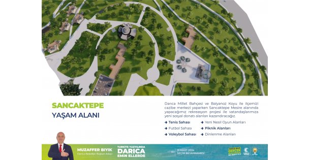 "Kentsel Cazibe Merkezleri" ve "Yeni Yaşam Alanları" başlığı altında Darıca'ya değer katacak projeler hazırladıklarını dile getiren Başkan Muzaffer Bıyık, "5 yıl boyunca ilçemize birçok eser ve hizmet kazandırdık. Aynı kararlılıkla canla başla çalışarak Darıca'mızın cazibesine değer katacak marka değerini artıracak yeni projeleri yeni dönemde hayata geçireceğiz. Millet Bahçesi ve Balyanoz Koyu'ndaki çalışmalarımızın yanı sıra Sancaktepe Yaşam Alanı Projesi ile Darıca'mızın nefes aşacağı bir merkezi daha hayata geçireceğiz. Tenis sahaları, futbol, voleybol ve basketbol sahaları, piknik alanları, dinlenme alanları ve yeni nesil oyun alanları ile Sancaktepe'yi gerçek anlamda bir yaşam alanına dönüştüreceğiz. Sancaktepe'ye yeni bir ulaşım aksı da açarak ulaşımı daha kolay hale getireceğiz" dedi.