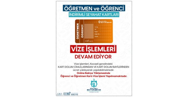 Kocaeli Büyükşehir Belediyesi Ulaşım Dairesi Başkanlığı Seyahat Kartları Şefliği’nce düzenlenen indirimli öğretmen ve öğrenci seyahat kartları için Büyükşehir Belediyesi’nden vize uyarısı geldi. Öğretmen ve öğrencilerin Kocaeli Büyükşehir Belediyesi’nce belirlenen indirimden yararlanabilmesi için, indirimli seyahat kartlarını vizeletmesi gerekiyor.