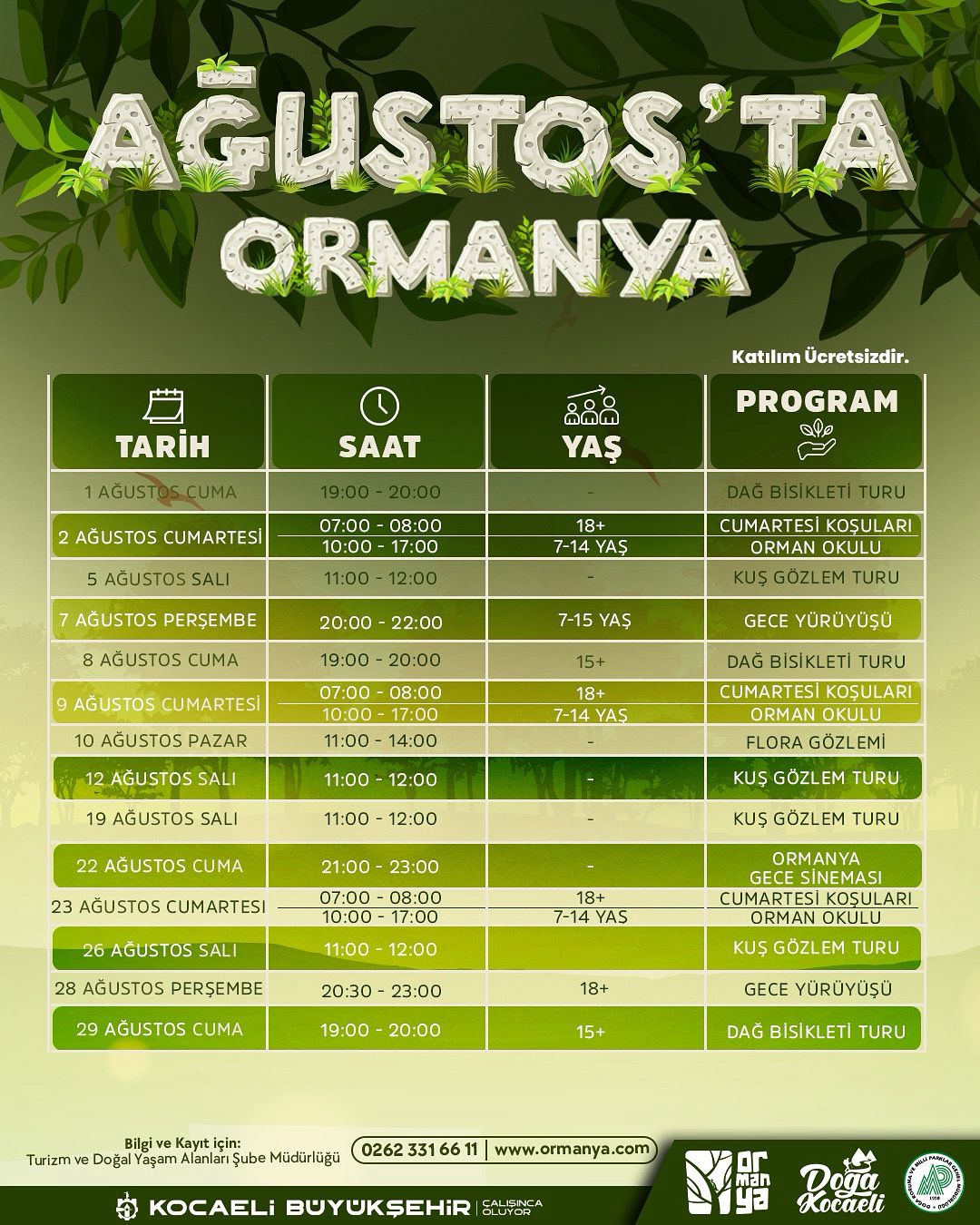 Tüm etkinlikler ücretsiz olarak düzenlenirken, yaş gruplarına göre planlanan programlarla her yaştan katılımcı doğada keyifli vakit geçirme şansı buluyor. 18 yaş üstü bireyler için cumartesi sabah koşuları, çocuklar için özel tasarlanmış orman okulu eğitimleri gibi farklı etkinlikler takvimde yer alıyor. Detaylı bilgi almak isteyenler, Ormanya için 0262 331 66 11, Kuzuyayla için ise 0533 526 80 80 numaralı telefonu arayabilir.