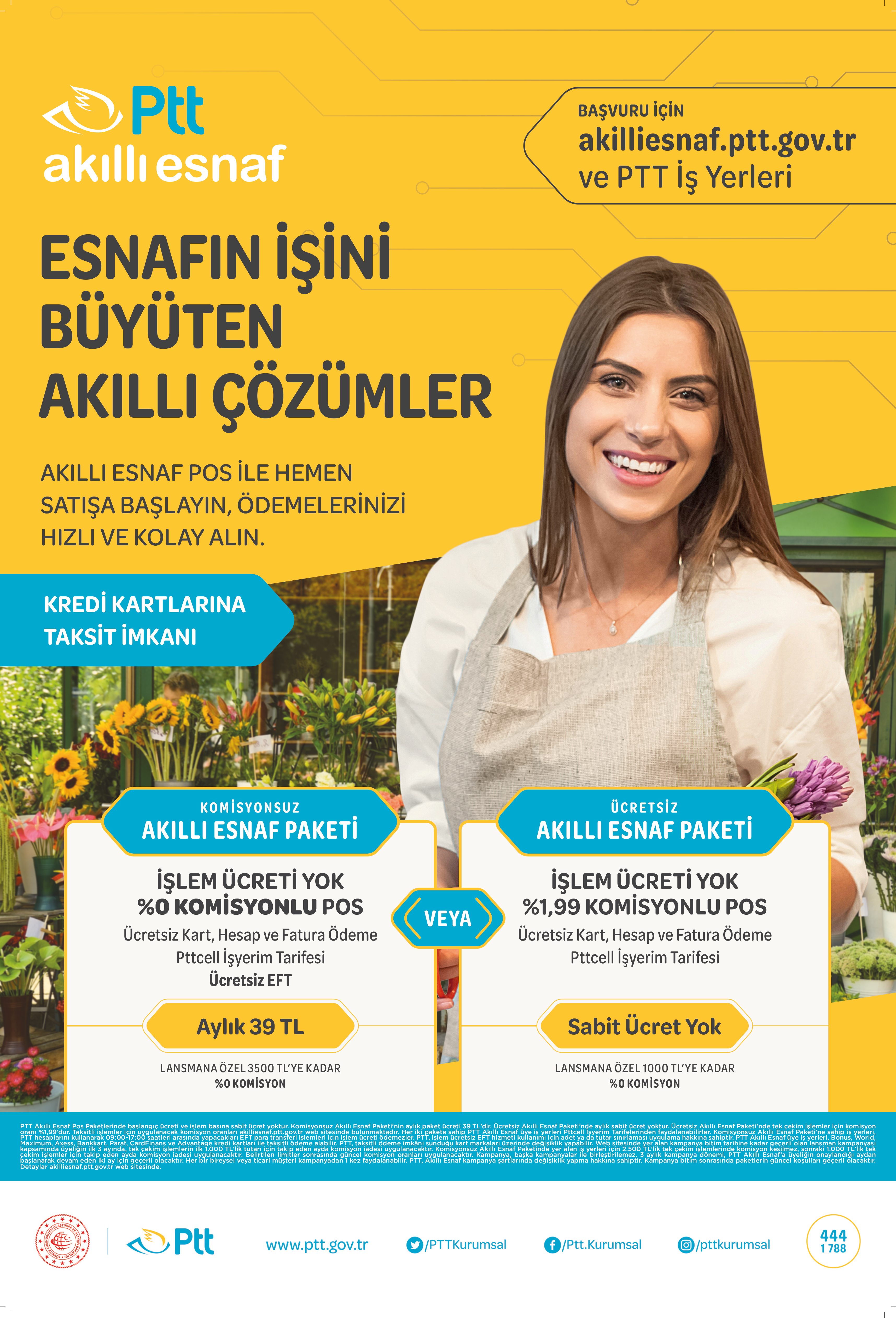 Posta ve Telgraf Teşkilatı Anonim Şirketi’nin (PTT AŞ), ülke ekonomisine büyük katkılar sağlayan esnaf, sanatkâr, KOBİ ve tüm bireysel satıcıların hayatını kolaylaştırmak için hazırladığı PTT Akıllı Esnaf Projesi ile esnaflar işlerini büyütebilecek. Ayrıca lansmana özel sıfır komisyon kampanyası ile 30 Mart tarihinden itibaren, ücretsiz ve komisyonsuz paket seçenekleri ile de maliyetleri düşecek. Projeden, pazar ve stant satışı ve kapıda teslimat yapan, temassız ödeme almak isteyen, ilave cihaz taşımadan kendi cep telefonları veya tabletlerinden tahsilat yapmak isteyenler de faydalanabilecek.