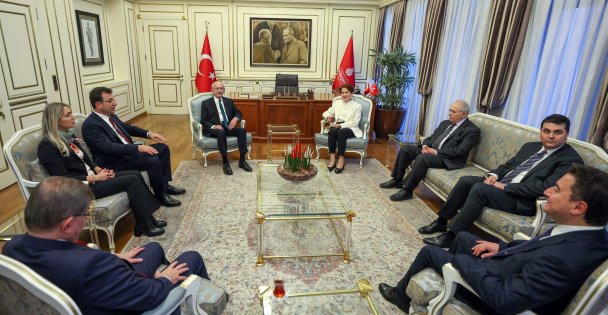 CHP Genel Başkanı Kemal Kılıçdaroğlu (sol 4), İYİ Parti Genel Başkanı Meral Akşener (sağ 4), Gelecek Partisi Genel Başkanı Ahmet Davutoğlu (solda), Deva Partisi Genel Başkanı Ali Babacan (sağda), Demokrat Parti Genel Başkanı Gültekin Uysal (sağ 2), Saadet Partisi Genel Başkanvekili Sabri Tekir (sağ 3), İstanbul Büyükşehir Belediye (İBB) Başkanı Ekrem İmamoğlu (sol 3), Anadolu 7. Asliye Ceza Mahkemesinin İBB Başkanı İmamoğlu hakkındaki mahkumiyet kararının ardından düzenlenen ''Millet, iradesine sahip çıkıyor'' mitingi öncesinde Saraçhane'deki belediye binasında bir araya geldi.