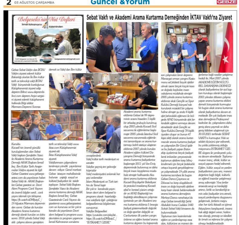 19 Ağustos Marmara depremin den sonra Gebze de kurulan Akademi Arama kurtarma derneği olarak kurulan ve daha sonra 2018 yılında Sebat Vakfı aldı çalışma alanını genişleten dernek ve Vakıf dan İlim kültür tarih ve teknoloji Vakfı www.iktav.com Kütüphanemizi ziyaret etti.
