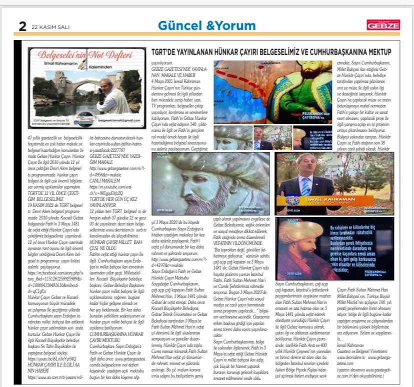 Hünkar Çayırı’nın Türkiye gündemine gelmesi ile ilgili yıllardan beri mücadele verip haber, yazı, TV programları, belgeseller çekip yayınlıyor, konferans ve seminerlere katılıyorum. Fatih’in Gebze Hünkar Çayırı’nda vefat edişinin 540. yıldönümü ile ilgili ve Fatih’in gençlere rol model örnek hayatı ile ilgili hazırladığımız belgesel sinevizyonunu sizlerle paylaşıyorum. Geçtiğimiz yıl 3 Mayıs 2020’de bu köşede Cumhurbaşkanı Sayın Erdoğan’a hitaben yazdığım makaleyi bir kez daha sizlerle paylaşarak, Fatih’i vefat yıl dönümünde bir kez daha rahmet ve şükranla anıyorum.