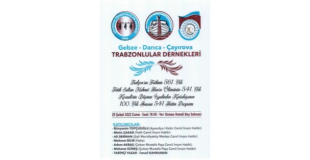 Gebze bölgesindeki Trabzonlular dernekleri, iki önemli programı hayata geçirecekler. Gebze Trabzonlular Derneği, Darıca Trabzonlular Derneği ve Çayırova Trabzonlular Derneği'nin ortaklaşa gerçekleştireceği ilk program, 12 Şubat Cumartesi günü Tatlıkuyu Kapalı Pazar Yeri'nde Trabzon Tanıtım günleri düzenlenecek.Gebze-Darıca-Çayırova Trabzonlular Dernekleri Trabzon’un fethinin 561. Yılı, Fatih Sultan Mehmet Han’ın ölümünün 541. Yılı ve Kocaeli’nin düşman işgalinden kurtuluşunun 100. Yılı anısına 541 Hatim Programı gerçekleştirecek. 25 Şubat Cuma akşamı saat 19.00’da Gebze Osman Hamdi Bey Kültür Merkezi’nde gerçekleşecek olan programa Ayasofya-i Kebir Cami İmam Hatibi Bünyamin Topçuoğlu, Fatih Cami İmam Hatibi Metin Çakar, Şişli Mecidiyeköy Merkez Cami İmam Hatibi Ali Derman, Çoban Mustafa Paşa Cami İmam Hatibi Adem Akbaş ve Mehmet Güneş ile tarihçi-yazar İsmail Kahraman katılacak. Hatim programı öncesi bugün Cuma namazı sonrası Gebze 15 Temmuz Milli İrade Kent Meydanı’nda hamsi ekmek ikramında bulunulacak.