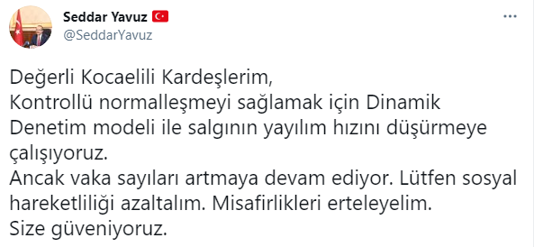 Son günlerde hızla artış gösteren koronavirüs vaka sayılarına dikkat çeken Kocaeli Valisi Seddar Yavuz, vatandaşlara uyarılarda bulunarak ''Sosyal hareketliliği azaltalım, misafirlikleri erteleyelim'' dedi.