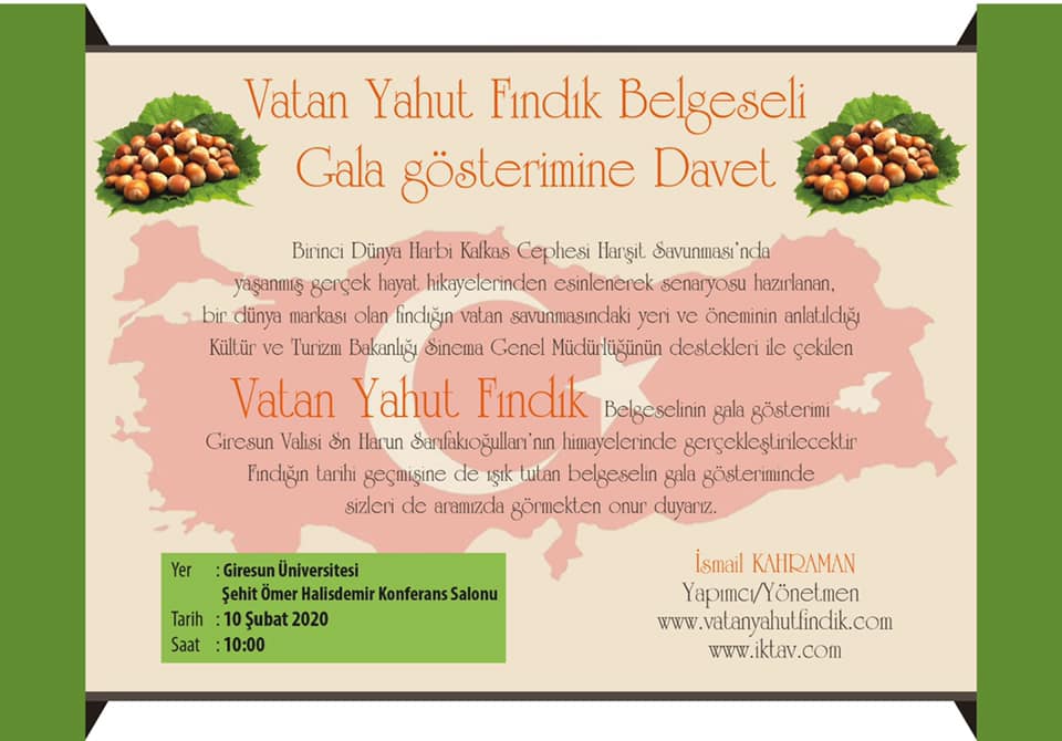 Vatan Yahut Fındık Belgeselinin gala gösterimi 10 Şubat Pazartesi günü saat 10:00’da Giresun Üniversitesi şehit Ömer Halisdemir Konferans Salonu’nda gerçekleştirilecek.